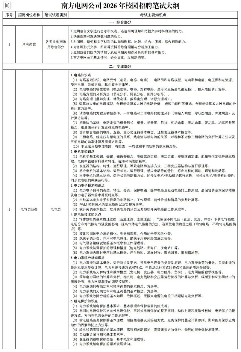(1)2026年校园招聘笔试由南方电网公司统一组织实施,一般采取计算机考试(闭卷)模式。笔试范围包括综合知识(占60%)和专业知识(占40%),其中专业知识考试内容按照招聘岗位对应的笔试试卷类别进行划分。南方电网公司2026年笔试大纲详见附件。